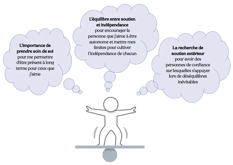 Maintenir un équilibre entre soutien et indépendance est crucial pour le bien-être de tout l'entourage, incluant votre propre bien-être et celui de votre être cher. Encourager l'autonomie de votre être cher est essentiel pour son développement et son sentiment de compétence. Cela peut impliquer de lui permettre de prendre des décisions quotidiennes, de gérer certaines responsabilités domestiques ou de participer à des activités sociales, tout en étant disponible en cas de besoin. Cette approche renforce leur confiance en eux et leur autonomie, tout en allégeant la charge pour les proches.