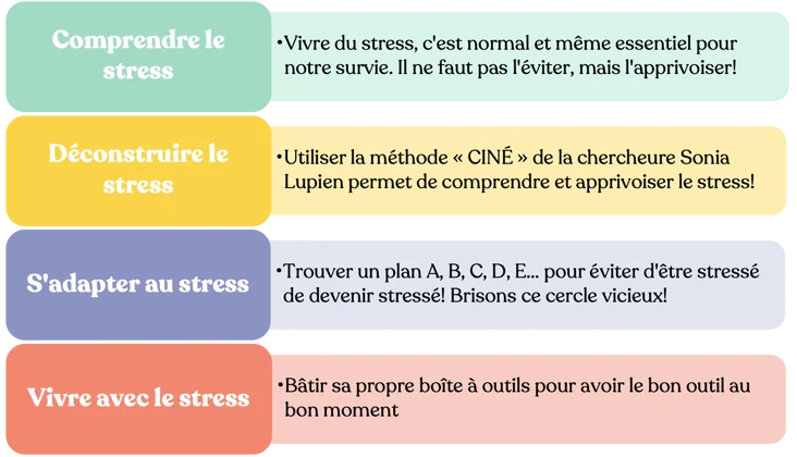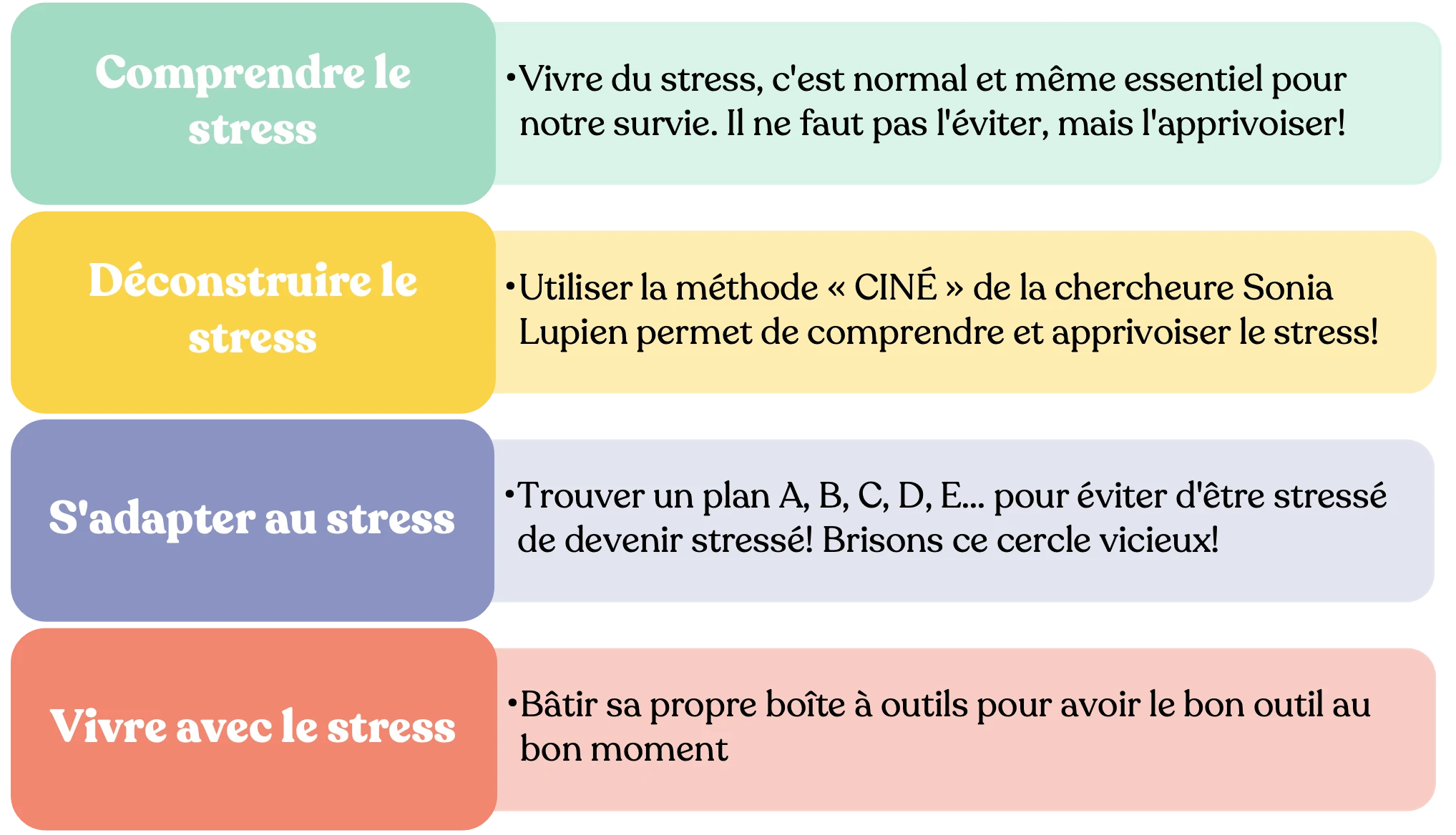 Si on craint de vivre du stress, ça risque de devenir un cercle vicieux : la peur du stress nourrit le stress, et on devient stressés à l’idée d’être stressés! Quelqu’un se reconnaît ici? C’est normal avec tout ce qu’on entend! Pourtant, comme tu le vois, le stress n’est pas si méchant : lorsqu’on s’intéresse à la bête, c’est plus facile de la contrôler. Alors une fois que nous avons compris d’où vient ce stress et pourquoi il est présent avec notre CINÉ, on peut enfin se demander : qu’est-ce que je peux faire?