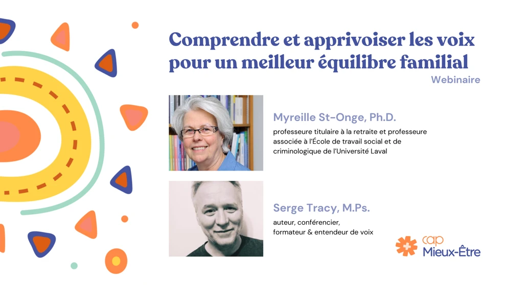 Le webinaire Comprendre et apprivoiser les voix pour un meilleur équilibre familial explore le phénomène des voix en compagnie de deux experts renommés Serge Tracy, auteur, formateur et entendeur de voix, et Myreille St-Onge, Ph.D., professeure associée en travail social.