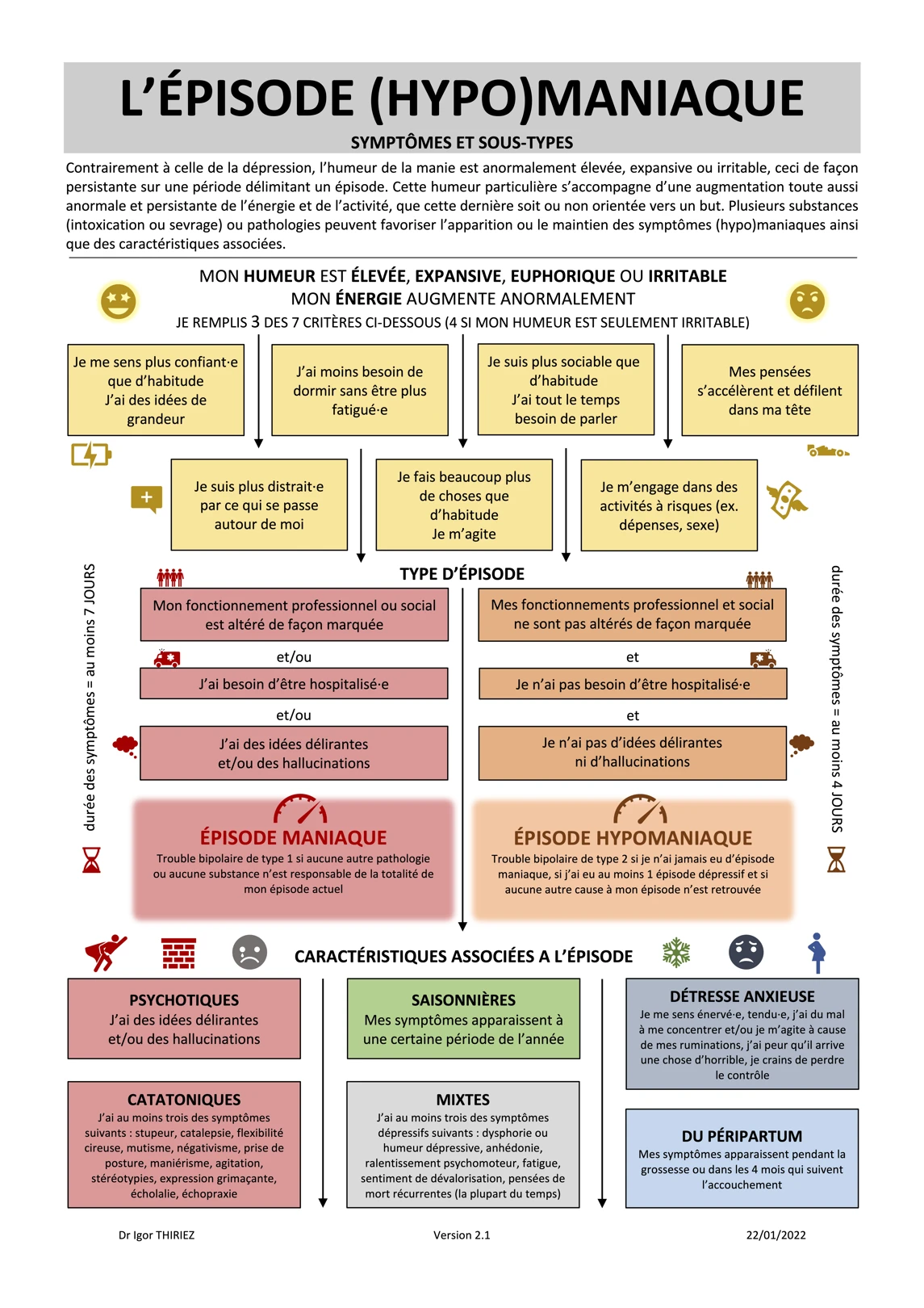 En complément du texte Le trouble bipolaire, voici un tableau illustré par Dr Igor Thiriez présentant l'épisode (hypo)maniaque.