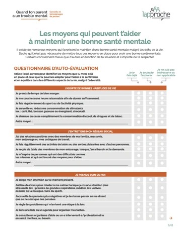Utilise l’outil suivant pour identifier les moyens que tu mets déjà en place et ceux que tu pourrais adopter pour t’aider à te sentir bien et en équilibre dans les différents aspects de la vie, malgré l’adversité.