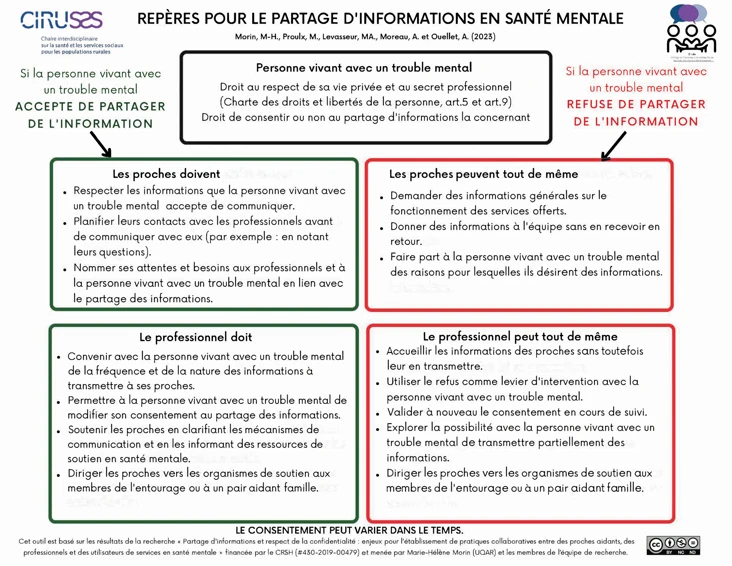 Selon que la personne vivant avec un trouble de santé mentale accepte (en vert) ou refuse (en rouge) le partage d’informations avec vous, les options possibles sont précisées en tenant compte des aspects légaux, déontologiques et cliniques.
