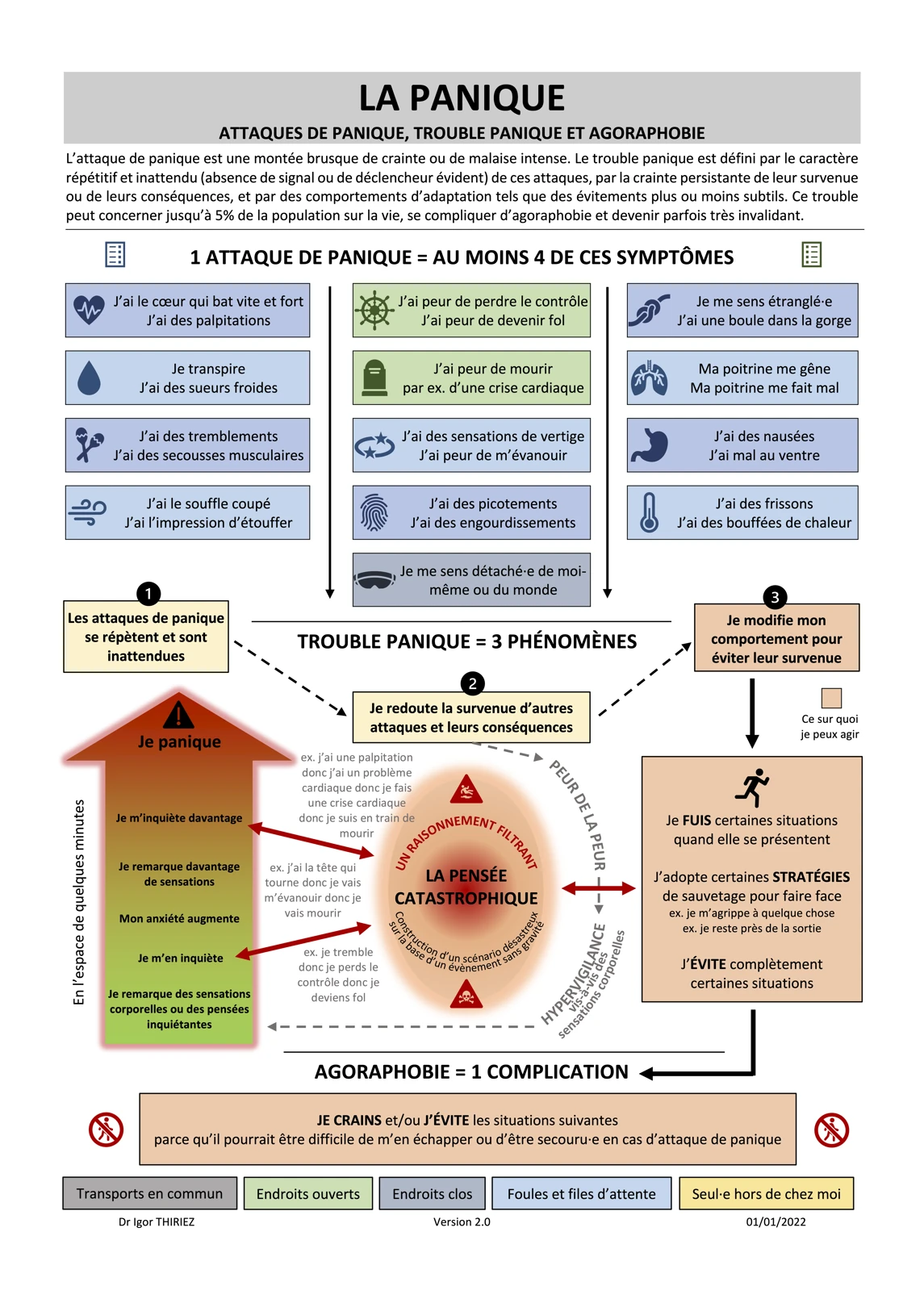 En complément du texte Les troubles mentaux les plus fréquents, voici un tableau illustré par Dr Igor Thiriez présentant les attaques de panique, le trouble panique et l'agoraphobie.