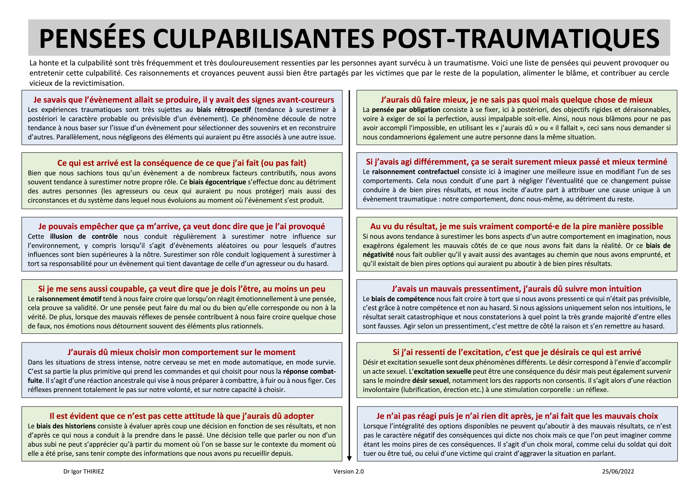 En complément du texte Les troubles mentaux les plus fréquents, voici un tableau illustré par Dr Igor Thiriez présentant les pensées culpabilisantes post-traumatiques.