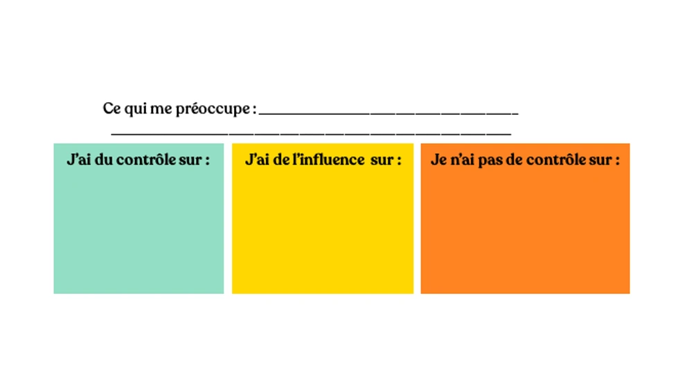 En se posant ces questions, vous pouvez compléter une liste des éléments qu’il vous est possible de contrôler, d’influencer et ceux sur lesquels vous n’avez aucun contrôle en lien avec une situation qui vous préoccupe. Nous vous invitons à prendre une pause et débuter cette réflexion.