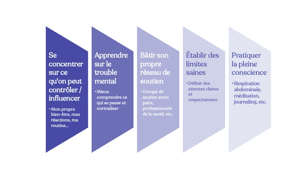 Logique non? On vous entend déjà dire : beaucoup plus facile à dire qu’à faire! Après avoir fait l’exercice de la première section de ce texte, vous avez pu déterminer ce que vous pouvez contrôler et ce que vous pouvez réellement influencer. Se concentrer sur ces éléments permet de réduire le stress et l'anxiété liés à l’imprévisibilité des conséquences d’un trouble mental. En décelant les aspects de la situation sur lesquels vous avez une influence directe, comme vos propres réactions, votre bien-être personnel et votre routine quotidienne, vous pouvez retrouver un certain sentiment de maîtrise. Cela implique de définir des objectifs réalistes, de pratiquer des techniques de gestion du stress et de rester flexible devant les défis qui se présentent. En investissant votre énergie dans ces domaines, vous pouvez créer un environnement plus stable et soutenant, ce qui bénéficie à la fois à vous, votre être cher et à tout l'entourage.