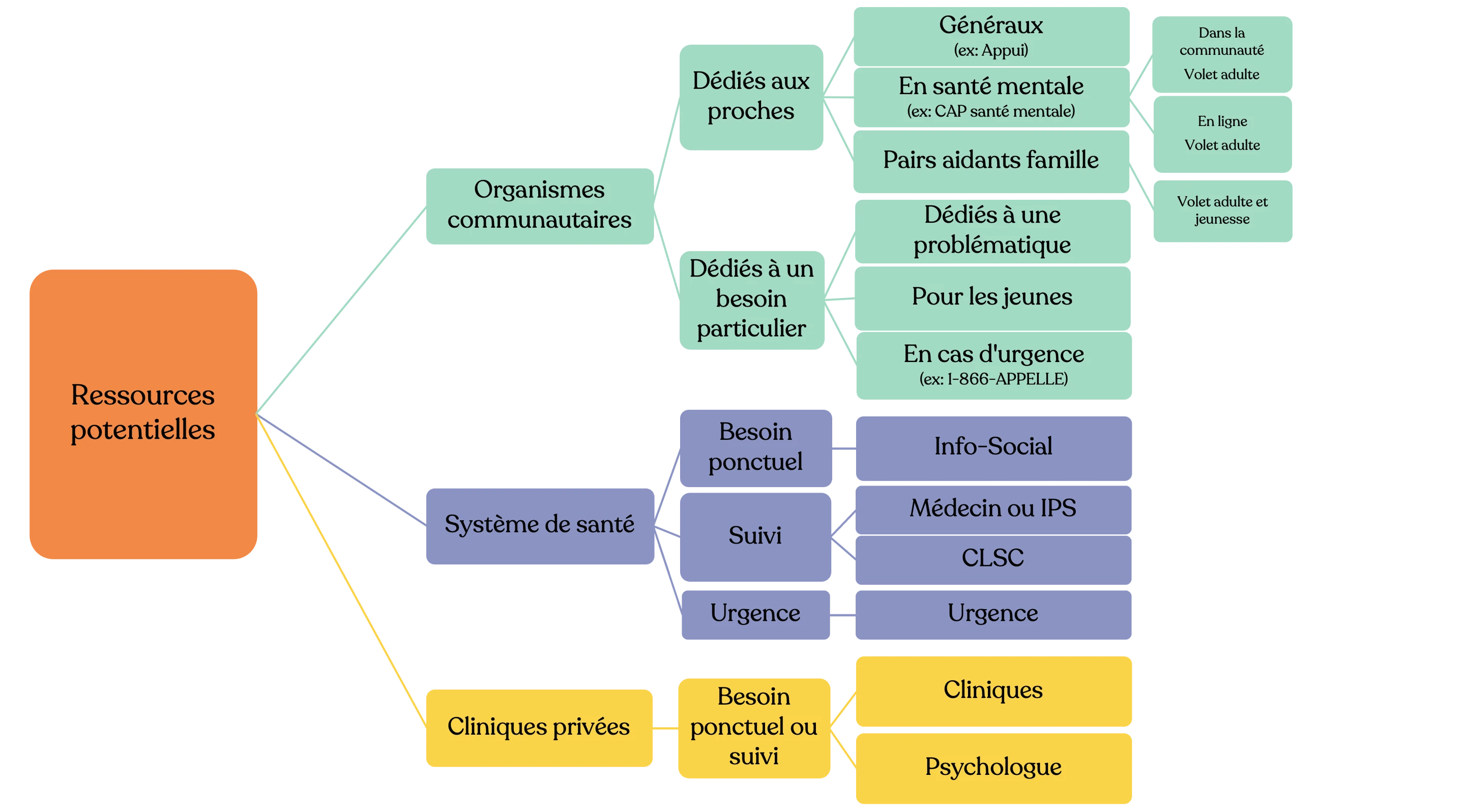 Vivre aux côtés d’une personne vivant avec un trouble de santé mentale peut être une expérience complexe avec son lot de montagnes russes. Heureusement, de nombreuses ressources se consacrent à fournir un accompagnement aux proches, facilitant ainsi le processus de compréhension et d'accompagnement que vous avez à faire. Ensemble, nous explorerons diverses ressources qui vous sont accessibles, classées en trois catégories principales : les organismes dans la communauté, les services du système de santé et les cliniques privées. La figure ci-dessous présente les différentes ressources qui seront explorées.