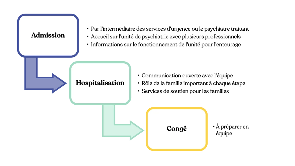 Dès l'arrivée dans le département de psychiatrie d’un hôpital, votre être cher sera accueilli par une équipe multidisciplinaire composée de psychiatres, d’infirmiers et d’autres professionnels de la santé mentale (voir articles sur les différents professionnels). Une évaluation initiale sera réalisée pour comprendre la nature de la crise et déterminer le plan de soins approprié. Dès le début de l’hospitalisation, laissez savoir à l’équipe votre désir de vous impliquer en expliquant votre rôle auprès de votre être cher.