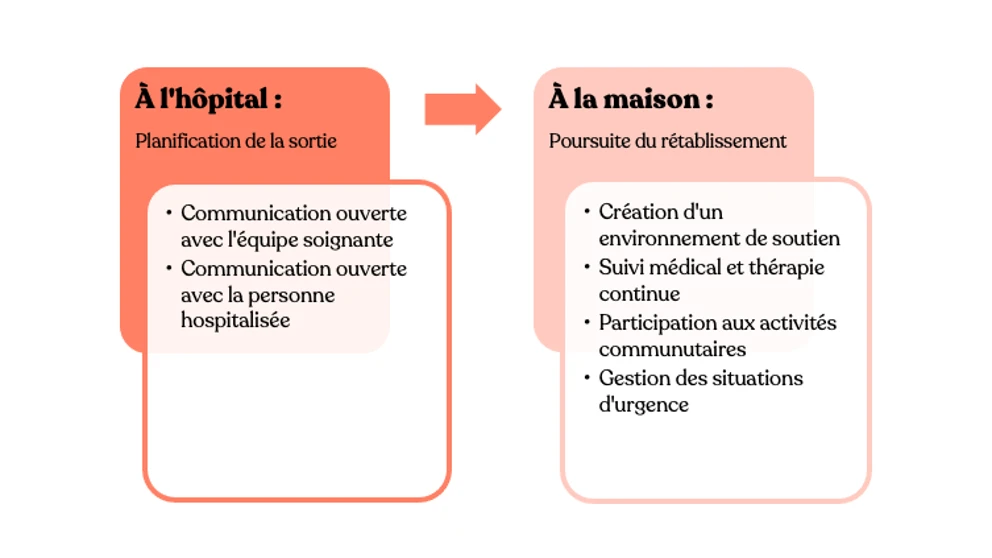 La sortie d’une hospitalisation en psychiatrie marque le début d’une nouvelle étape dans le parcours de rétablissement. L'entourage, en tant que soutien essentiel, joue un rôle central dans cette transition. En restant informé, en favorisant un environnement de soutien et en participant activement au processus de rétablissement, l'entourage peut contribuer de manière significative à la qualité de vie de la personne vivant avec un trouble de santé mentale. Le soutien continu, l’ouverture et l’empathie sont des clés importantes pour un rétablissement réussi.